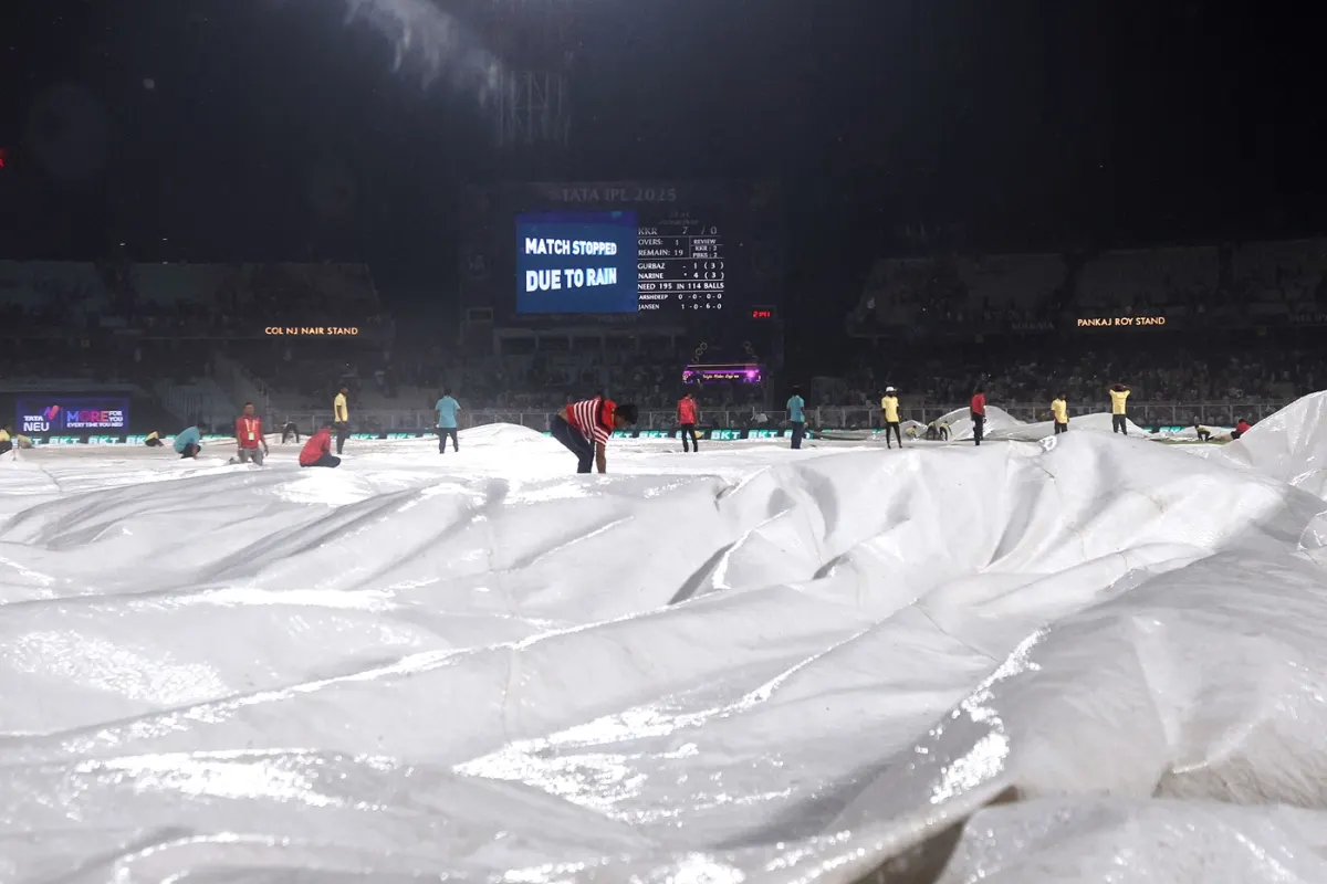 The ground staff ran onto the stadium with rain covers, which would not come off for the rest of the evening, as the match was first delayed due to rain and was then called off. Ajinkya Rahane’s KKR only needed to play five more overs before any result for this match could be declared.